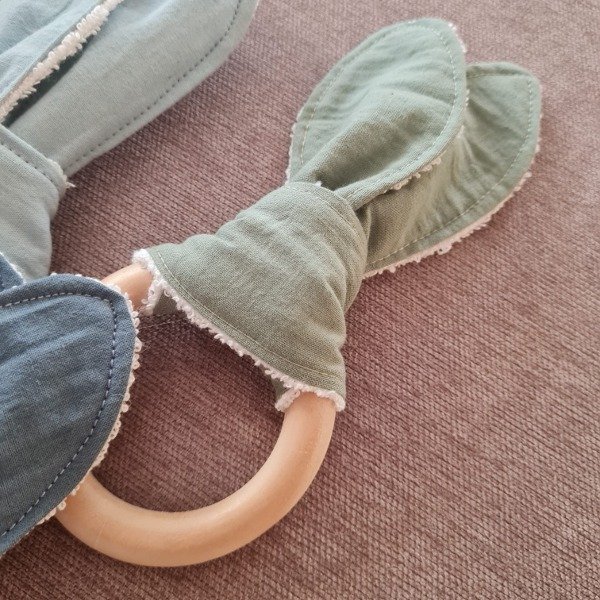 Para calmar la ansiedad de tu bebe tenemos mordedores de tela de tusor y aro de madera para un optimo agarre. Este modelo de orejitas de conejo tiene un diseño ergonómico y seguro. Pedí el modelo que quieras y lo armamos para vos.
